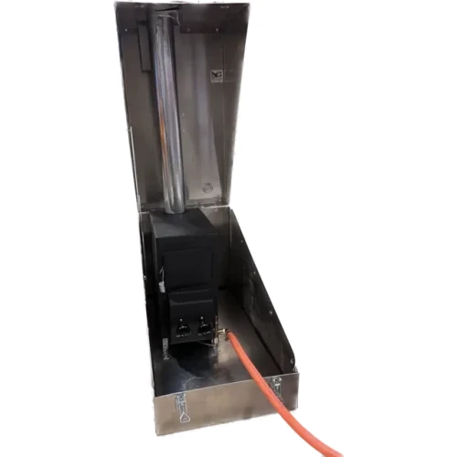 Aluminumskasse som er spesialtilpasset våre ovner. Kassene er laget slik at transport og bruk av våre ovner på tur skal være så enkelt som mulig. Ovnen fastmonteres i kassen (ved hjelp av poppnagler/skruer). Lokket er hengslet og fungerer som skjold rundt pipa, det låses enkelt i posisjon ved hjelp av stag m/hengsel og en vipplås. Det er også laget hull ferdig til pipa, her er det påmontert lokk som tetter hullet når kassen brukes til transport. Kassen er laget stor nok til at ovn og piperør får plass nedpakket.